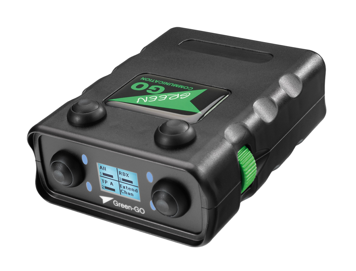 The Green-GO Beltpack X features a high-resolution full colour OLED display which shows information about channels, cue signals and the different functions that are operated by the four buttons on the front of the Beltpack. These buttons can be configured to provide instant access to up to four channels.